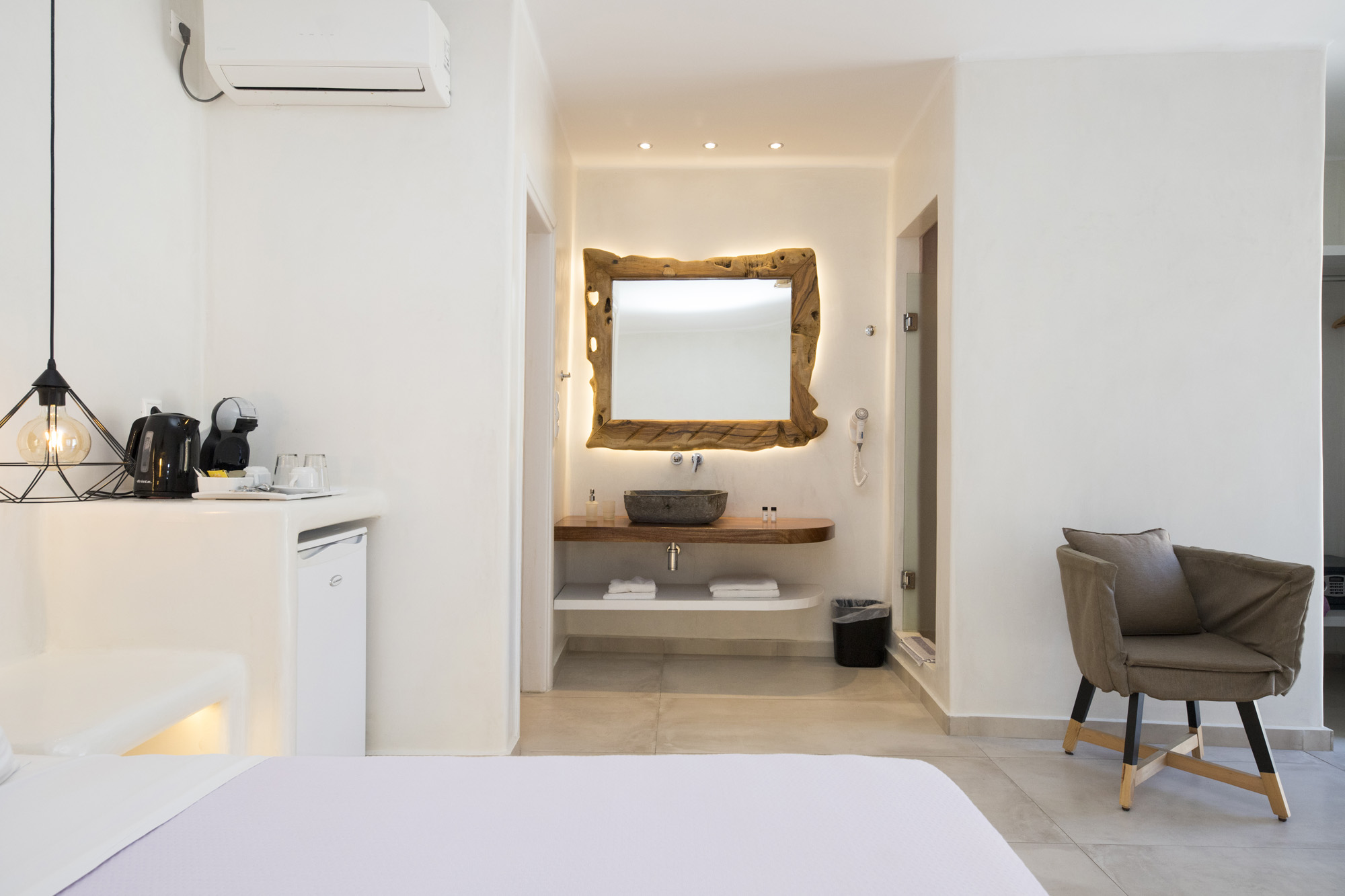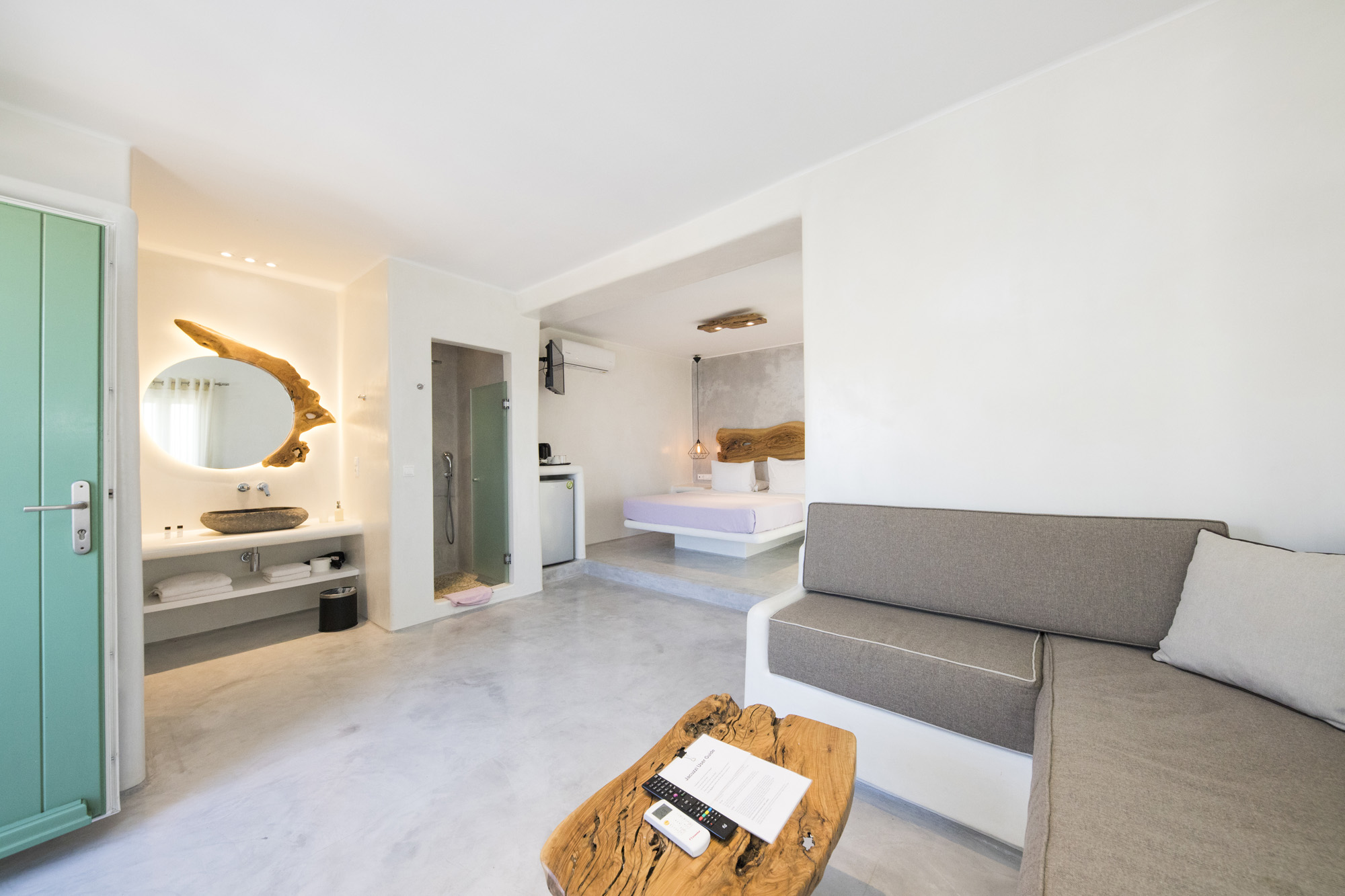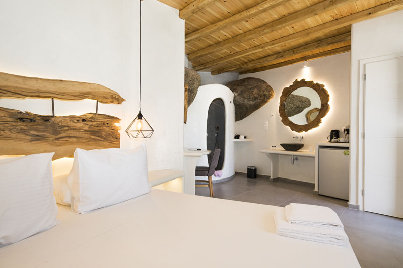 Featuring a combination of modern and traditional Cycladic architectural designs harmonically, inspired by the colours of Mykonos Island and the nature, Sahas premium sea view accommodation in Mykonos, offer minimal design looks, with natural colours and absolute comfort, when it comes to quality standards of each suite. The beauty and simplicity of every premium suite, infuses a calming atmosphere, which is further enhanced by the unique, breathtaking views of the blue waters of the Aegean Sea and the supreme Sunsets.