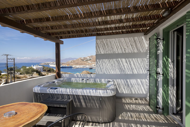 Ranging from basic Junior suites, to superior sea view and deluxe suites with a private jacuzzi, ideal for couples or friends, Sahas Luxury Suites, provide shiny clean and cozy sea view suites in Tagoo, near Mykonos Town, Greece. Furthermore, every suite also offers a private patio or balcony, with table and chairs., Sahas Luxury Suites central accommodation in Tagoo, is just about a 5 minute walk away from Mykonos Town center and about a 10 minute walk away from the nearest beach. These premium suites are an ideal option for high quality and romantic accommodation in Mykonos Island, in Greece.